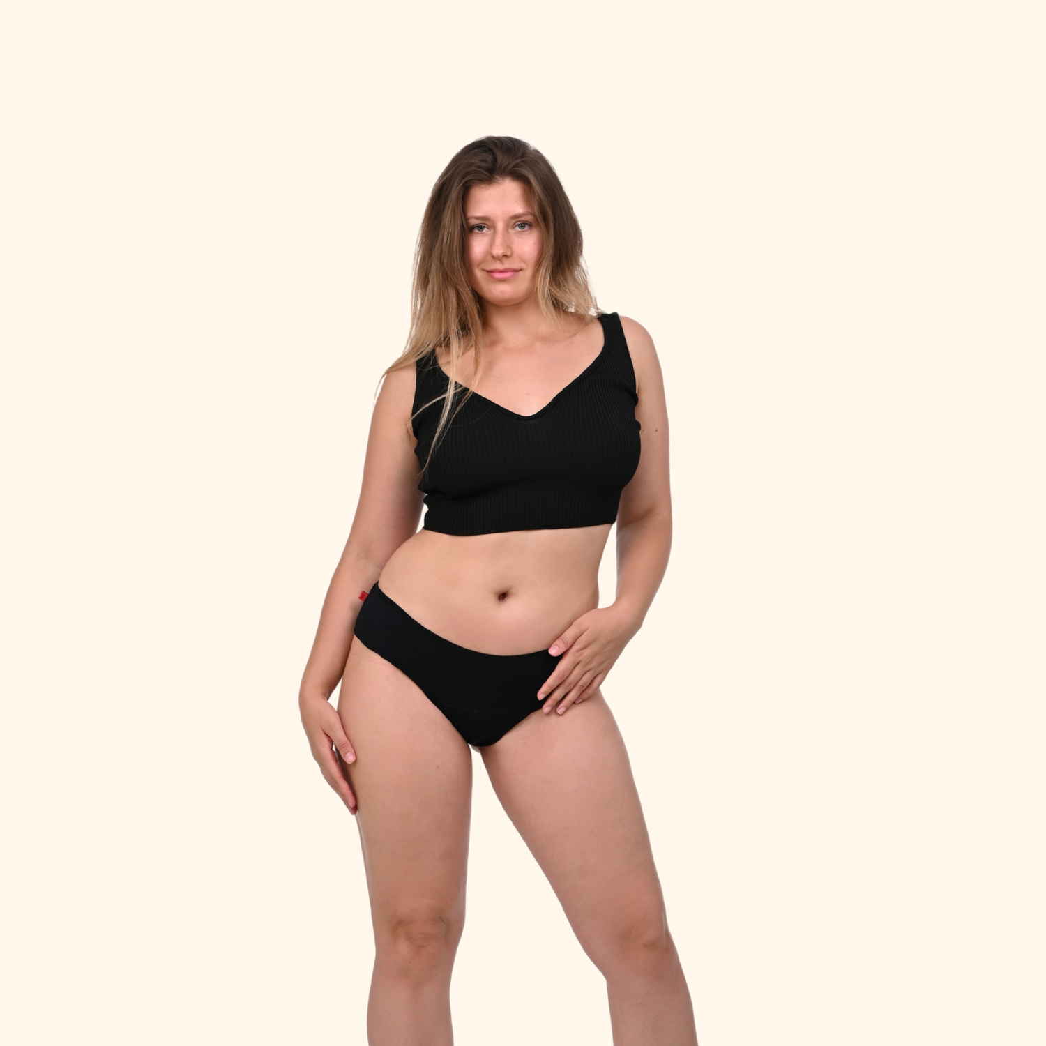 Belül mély bordó nedvszívó réteg, kívül elegáns fekete — diszkrét, praktikus és gyönyörű.