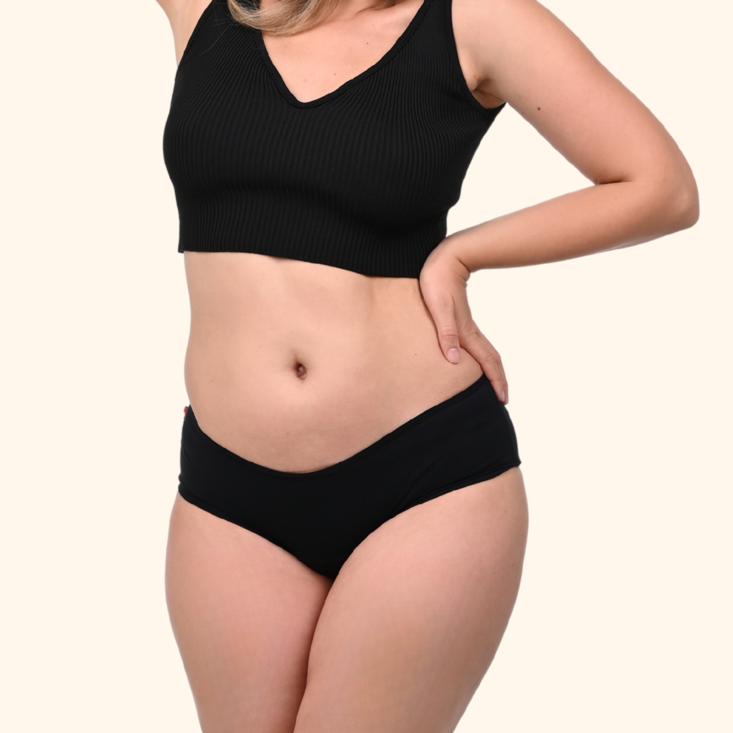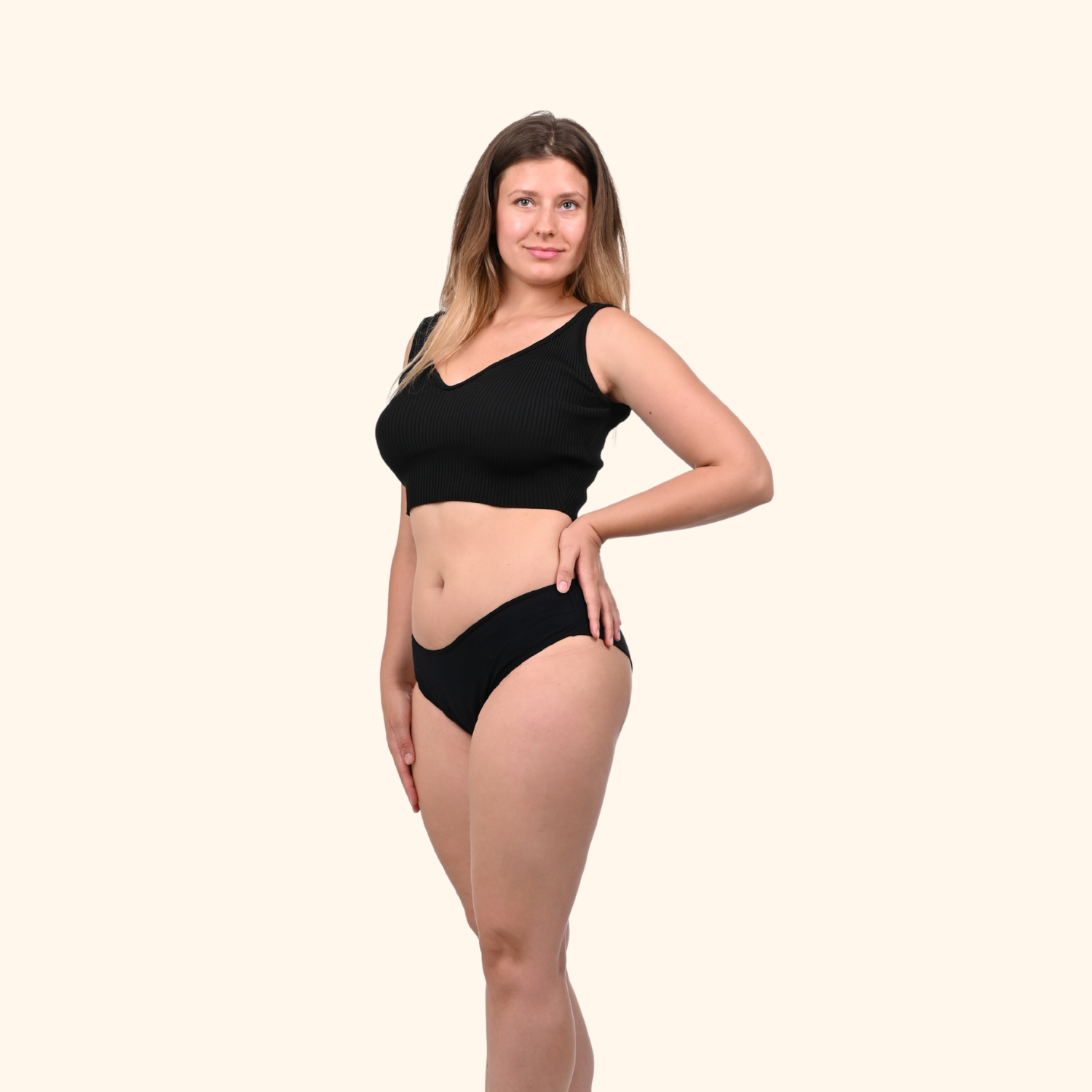 Belül most mély bordó nedvszívó réteg, kívül klasszikus fekete. Praktikus, diszkrét és esztétikus — mert a menstruáció is lehet kényelmes és szép egyszerre.